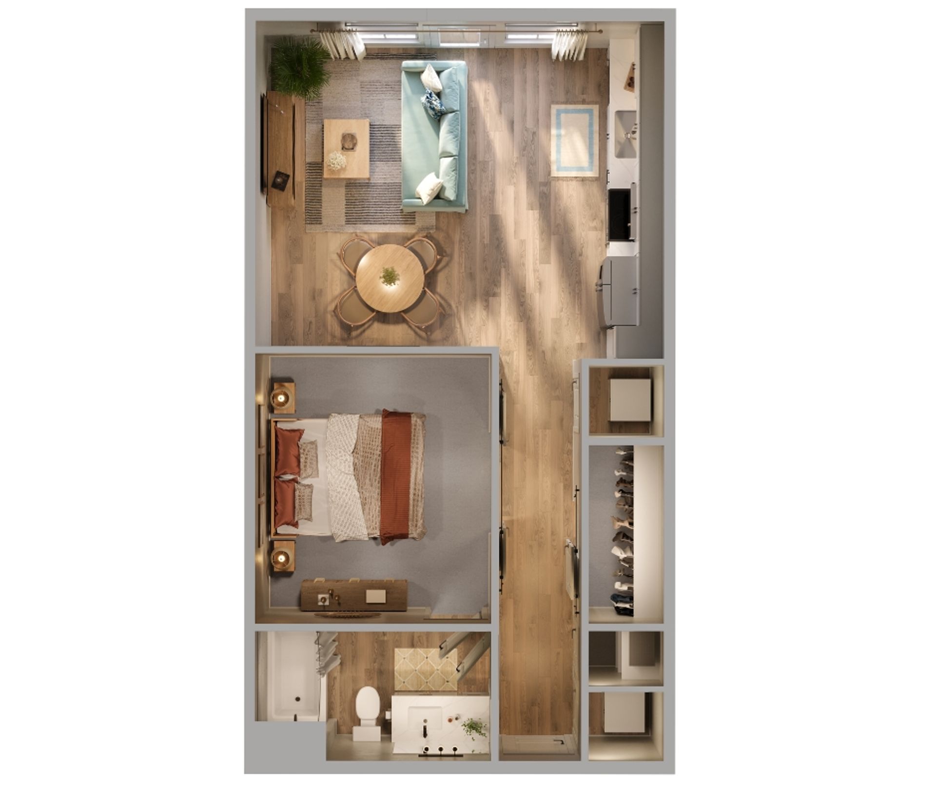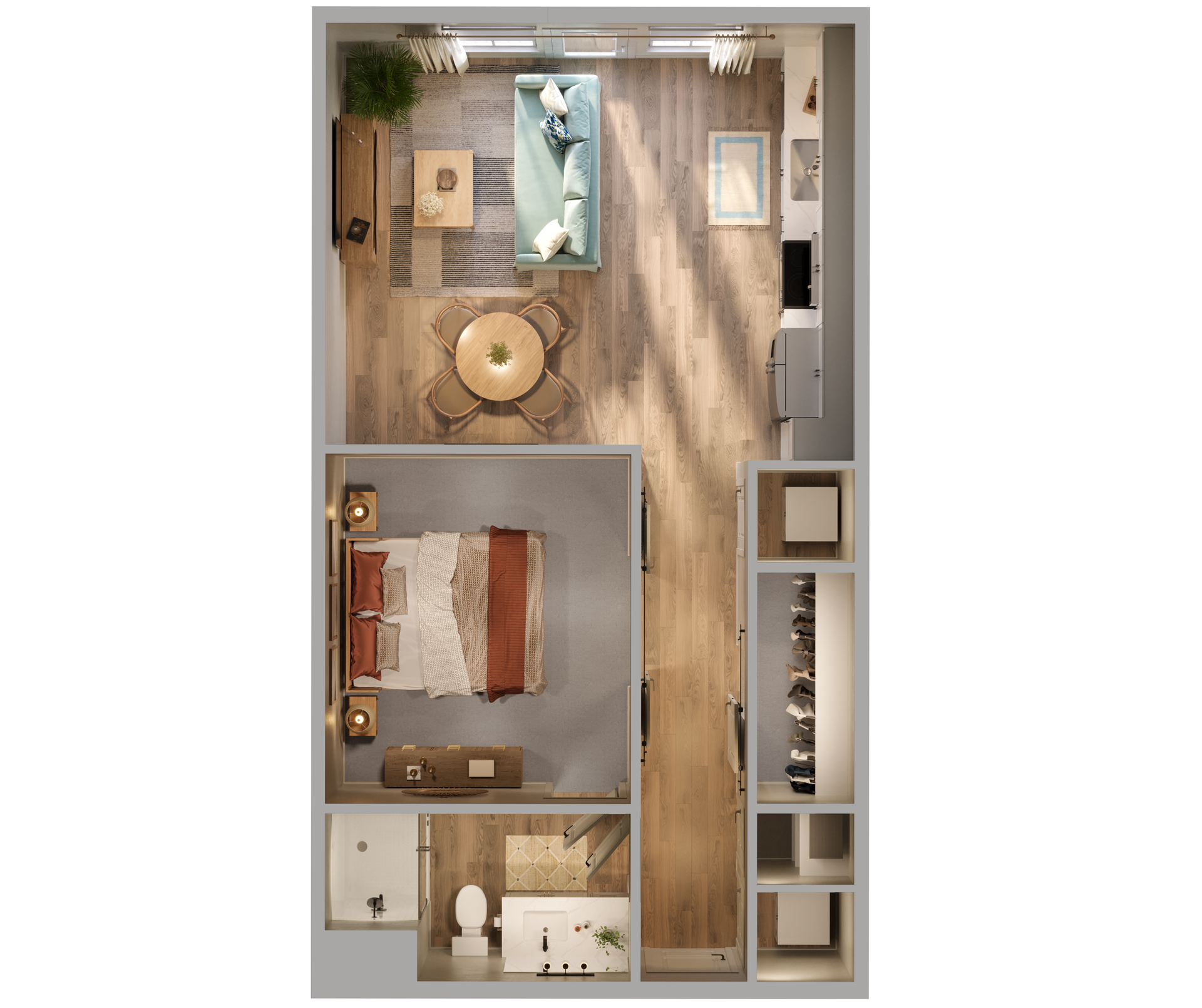 Discover our S2 Floor Plan – a beautifully designed 1-bedroom, 1-bathroom layout offering 650 sq. ft. of stylish living space. Each apartment features sleek stainless steel appliances, a full-size washer and dryer, and upscale finishes throughout for a modern, comfortable lifestyle.