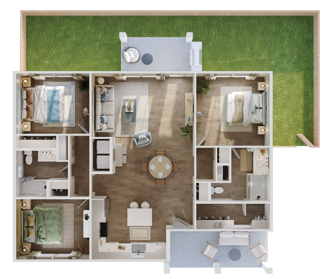 Discover our C1 Floor Plan – a beautifully designed 3-bedroom, 2-bathroom layout offering 1269 sq. ft. of stylish living space along with a fenced in private back yard. Each apartment features sleek stainless steel appliances, a full-size washer and dryer, and upscale finishes throughout for a modern, comfortable lifestyle.