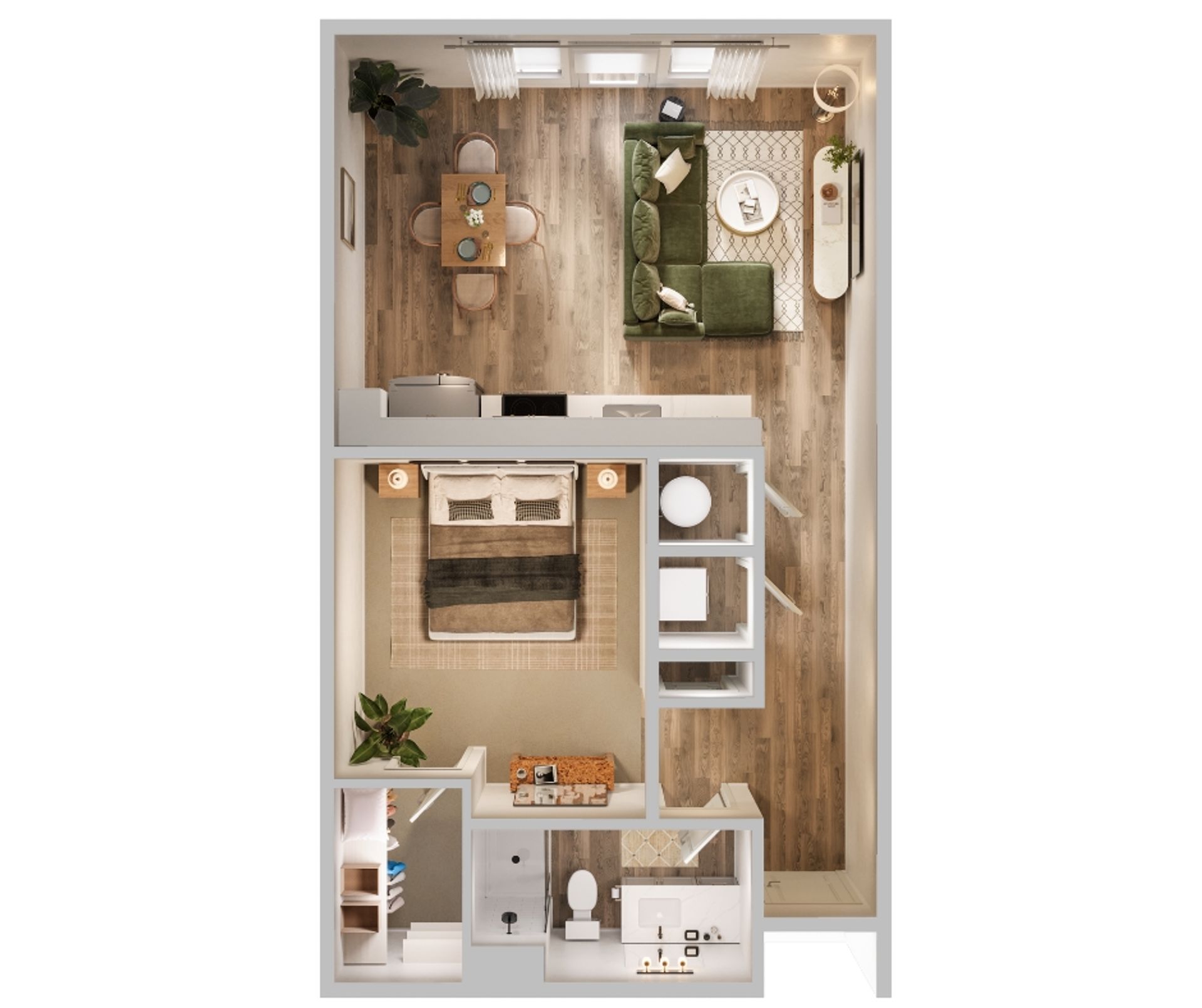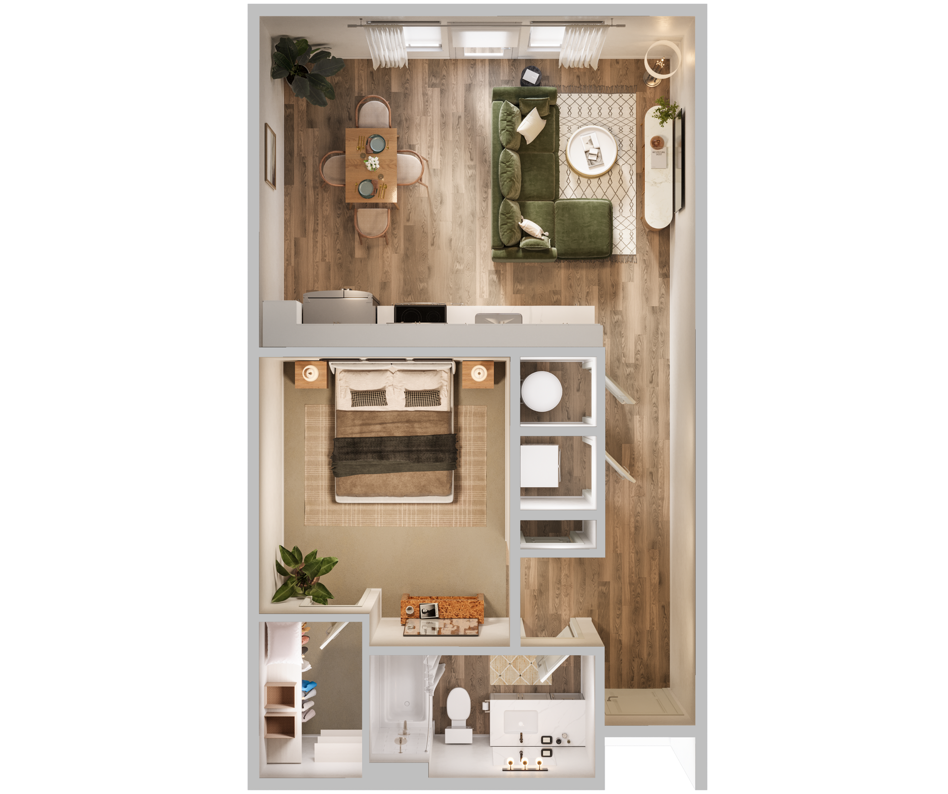 Discover our S1 Floor Plan – a beautifully designed 1-bedroom, 1-bathroom layout offering 650 sq. ft. of stylish living space. Each apartment features sleek stainless steel appliances, a full-size washer and dryer, and upscale finishes throughout for a modern, comfortable lifestyle.