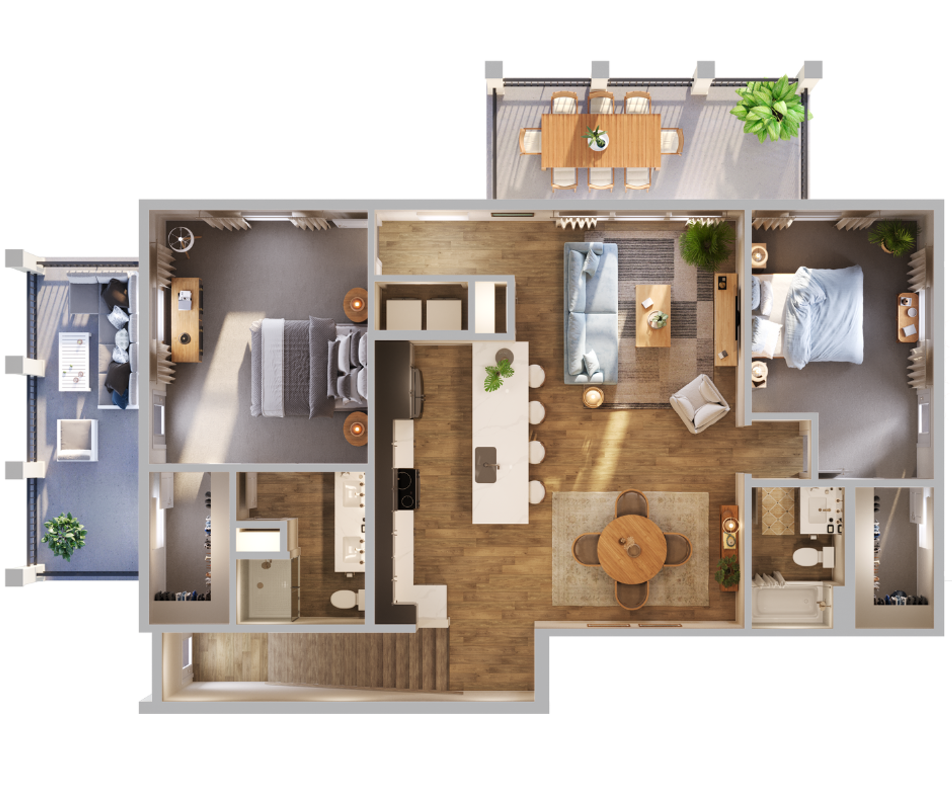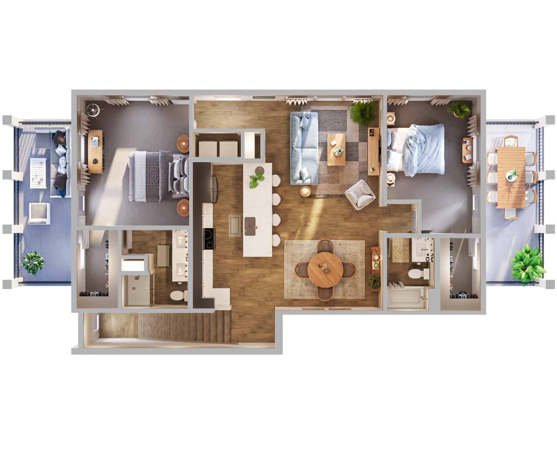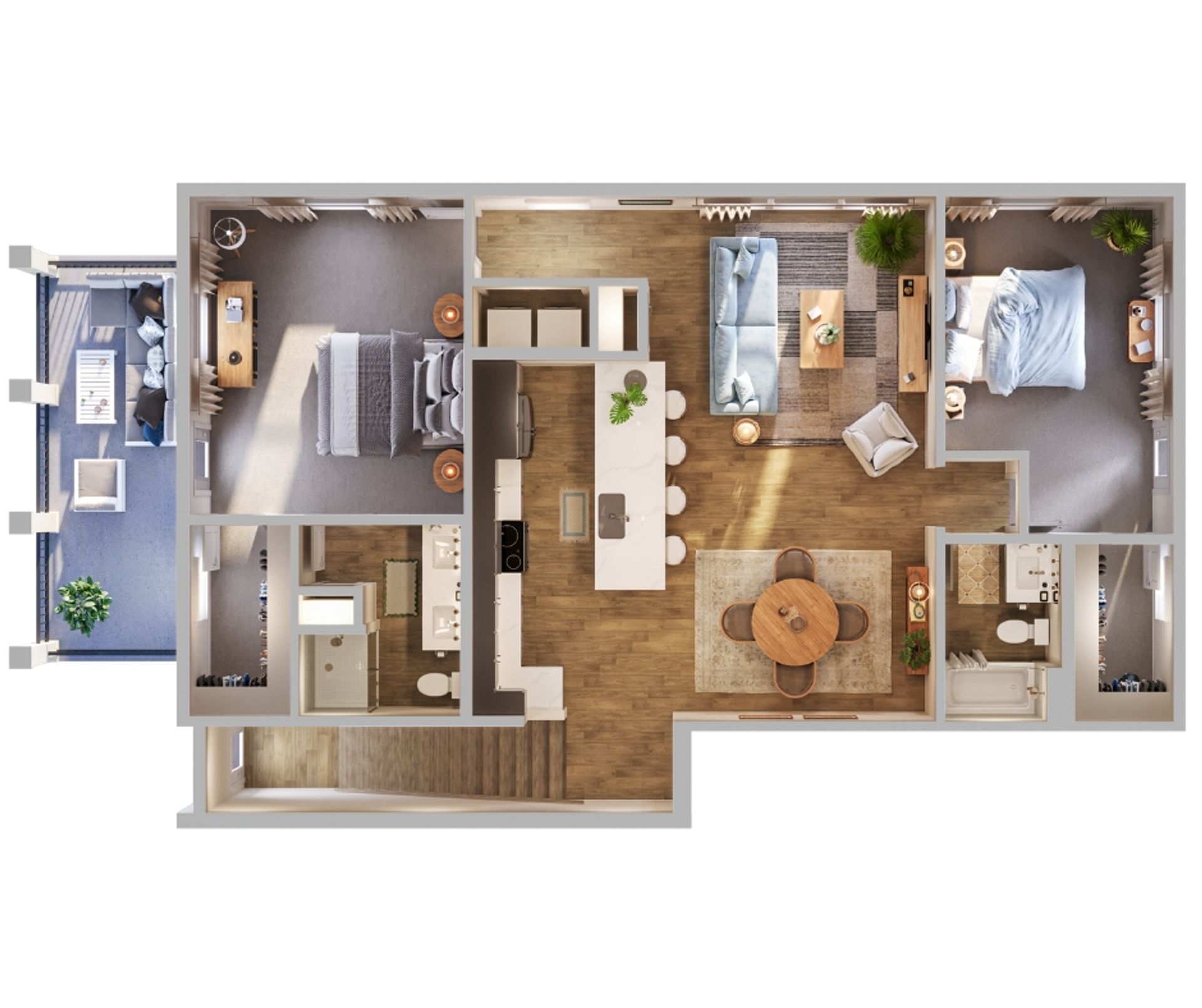 Discover our B4 Floor Plan – a beautifully designed 2-bedroom, 2-bathroom layout offering 1340 sq. ft. of stylish living space along with amble private balcony space. Each apartment features sleek stainless steel appliances, a full-size washer and dryer, and upscale finishes throughout for a modern, comfortable lifestyle.